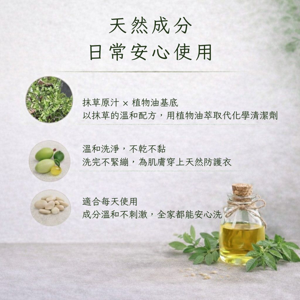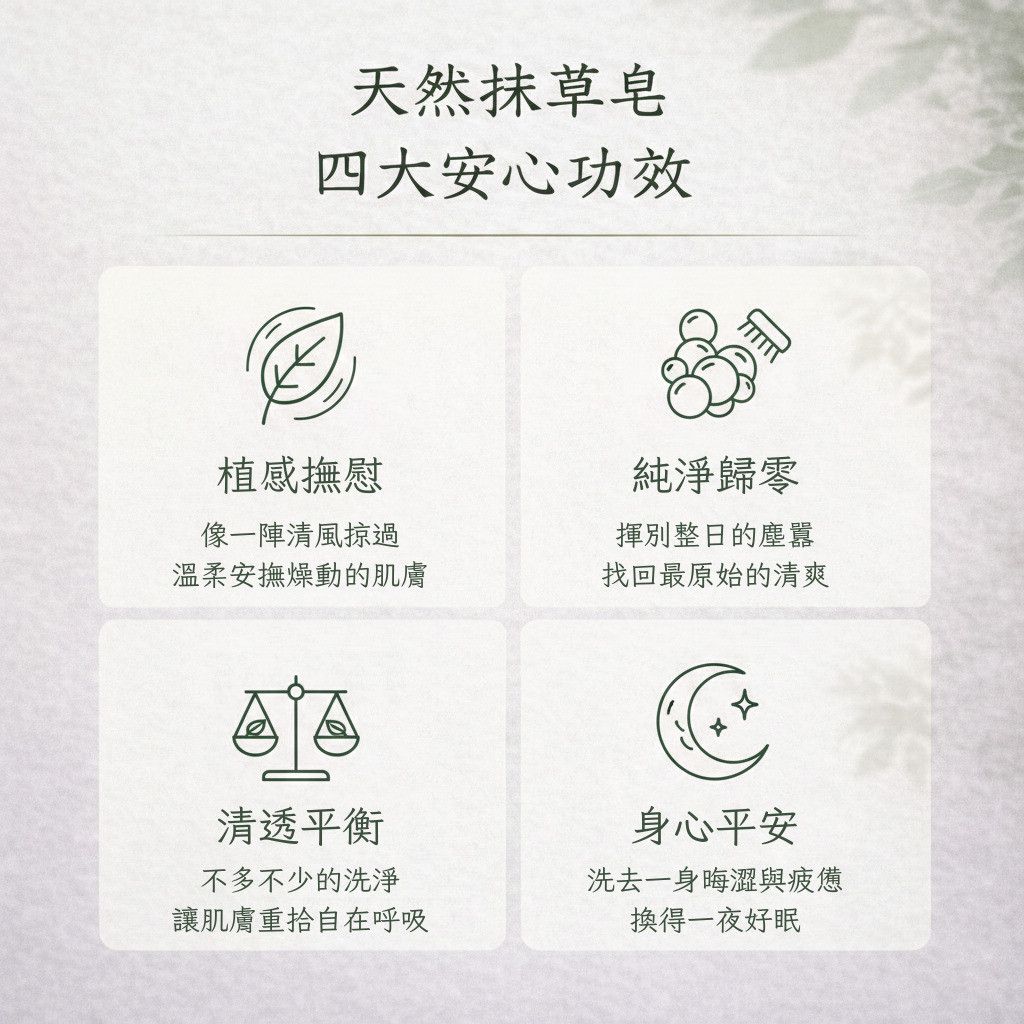 抹草原汁、椰子油、橄欖油、棕櫚油、玄米油、葡萄籽油、葵花油、氫氧化鈉(皂化用)