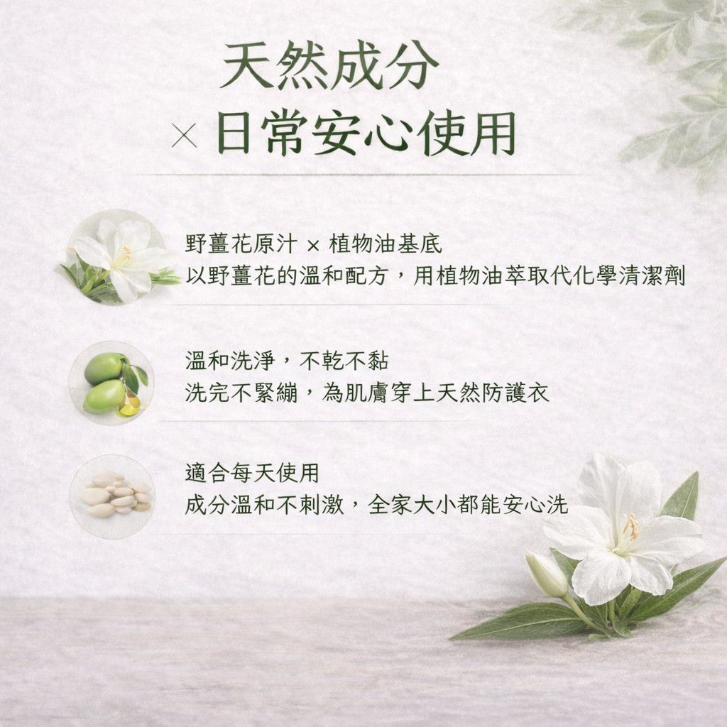 野薑花原汁、椰子油、橄欖油、棕櫚油、玄米油、葡萄籽油、葵花油、氫氧化鈉(皂化用)