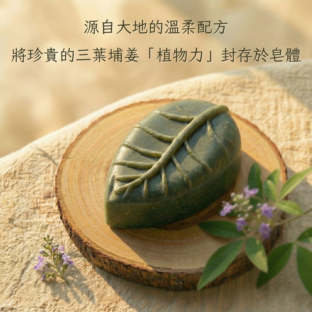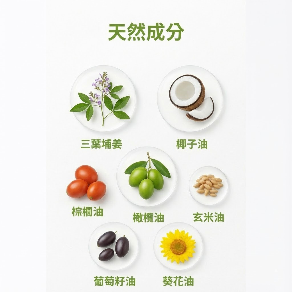 三葉埔姜原汁、椰子油、橄欖油、棕櫚油、玄米油、葡萄籽油、葵花油、氫氧化鈉(皂化用)